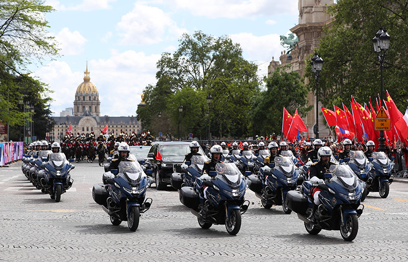 當(dāng)?shù)貢r(shí)間5月6日下午,正在法國(guó)進(jìn)行國(guó)事訪問(wèn)的國(guó)家主席習(xí)近平在巴黎出席法國(guó)總統(tǒng)馬克龍舉行的隆重盛大歡迎儀式。這是歡迎儀式后,習(xí)近平和夫人彭麗媛在共和國(guó)衛(wèi)隊(duì)148名騎兵組成的禮兵馬隊(duì)和摩托車隊(duì)護(hù)衛(wèi)下,乘車前往愛(ài)麗舍宮。新華社記者 高靜 攝