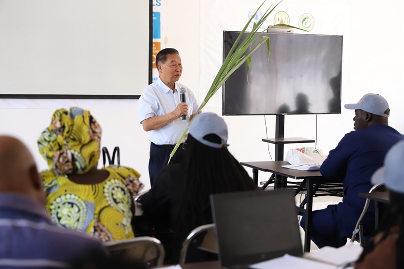 2024年8月4日,在位于盧旺達南方省胡耶區(qū)的中國援盧農(nóng)業(yè)技術示范中心,菌草發(fā)明人林占熺為培訓班學員講解菌草技術。新華社發(fā)(黃萬晴?攝)