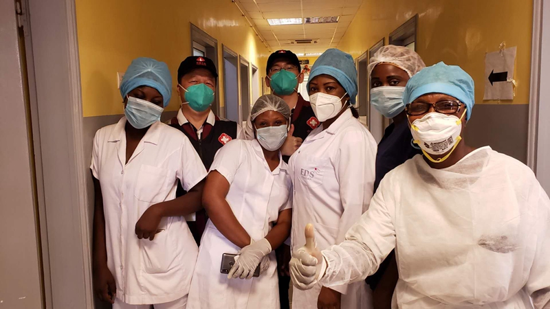 2020年5月26日,中國抗疫醫(yī)療專家組在剛果(布)首都布拉柴維爾指導新冠肺炎病房建設時,與當?shù)匾痪€醫(yī)務人員合影。新華社發(fā)