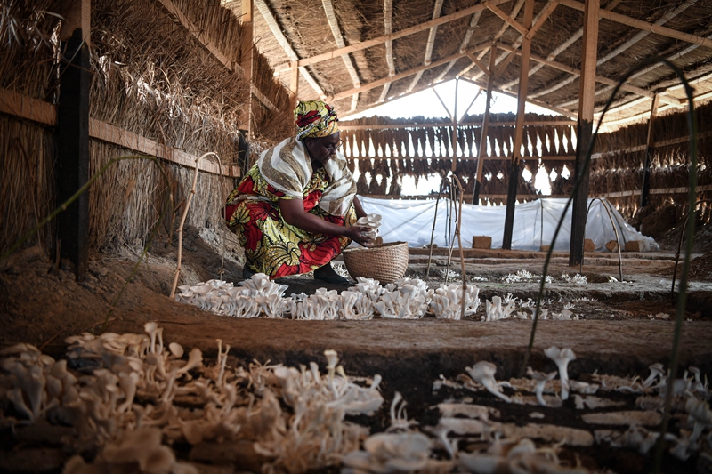 2024年2月6日,在中非共和國達馬拉,法蒂瑪在菇棚內(nèi)收獲菌草菇。2022年,法蒂瑪在聽說中國菌草專家在班吉傳授技術后主動前往學習,從一間小菌棚起步,逐漸擴大為如今小有名氣的合作社。新華社記者 韓旭 攝