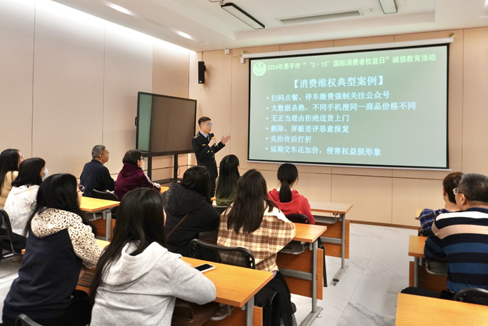 由市消費(fèi)者權(quán)益保護(hù)委員會(huì)工作人員就《消費(fèi)者權(quán)益保護(hù)法》的重點(diǎn)條款進(jìn)行講解,引導(dǎo)企業(yè)自覺履行主體責(zé)任,知法守法經(jīng)營(yíng),共同構(gòu)建誠(chéng)信和諧、安心消費(fèi)的消費(fèi)環(huán)境。隨后,現(xiàn)場(chǎng)觀看“消費(fèi)維權(quán)小劇場(chǎng)”的宣傳視頻,讓各企業(yè)對(duì)容易與消費(fèi)者發(fā)生的消費(fèi)糾紛有了直觀了解,提高各企業(yè)維護(hù)消費(fèi)者合法權(quán)益、規(guī)避消費(fèi)侵權(quán)風(fēng)險(xiǎn)的意識(shí)。接著,市消委會(huì)現(xiàn)場(chǎng)分析了近年來的消費(fèi)維權(quán)典型案例,對(duì)企業(yè)規(guī)范市場(chǎng)經(jīng)營(yíng)行為、消費(fèi)糾紛處理、廣告內(nèi)容宣傳、產(chǎn)品質(zhì)量保障等方面作行政指導(dǎo)。