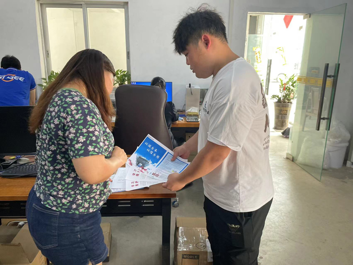 (工作人員向企業(yè)負(fù)責(zé)人發(fā)放宣傳資料)