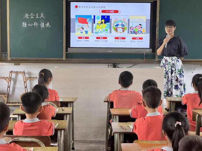 活動(dòng)中,輔導(dǎo)老師首先為大家播放了社會(huì)主義核心價(jià)值觀微視頻,將“富強(qiáng)、民主、文明、和諧,自由、平等、公正、法治,愛國(guó)、敬業(yè)、誠(chéng)信、友善”這24字核心價(jià)值觀牢牢印在孩子們的心里。老師強(qiáng)調(diào)了個(gè)人層面的“誠(chéng)信”要做到一言九鼎、重于泰山,還組織學(xué)生齊唱《中小學(xué)生講誠(chéng)信歌謠》。