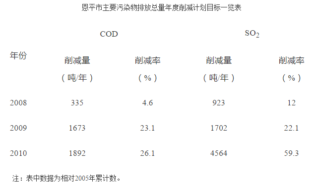 到2010年,全市主要污染物化學(xué)需氧量(COD)和二氧化硫(SO2)排放量分別控制在6593噸/年和5427噸/年以內(nèi)。