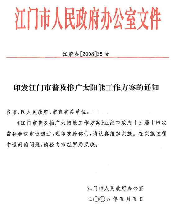 經(jīng)市人民政府同意,現(xiàn)將江門市政府辦公室《印發(fā)江門市普及推廣太陽能工作方案的通知》(江府辦〔2008〕35號(hào))轉(zhuǎn)發(fā)給你們,請(qǐng)認(rèn)真組織實(shí)施。并請(qǐng)市經(jīng)貿(mào)局結(jié)合本市實(shí)際,制訂我市普及推廣太陽能工作方案報(bào)市政府。