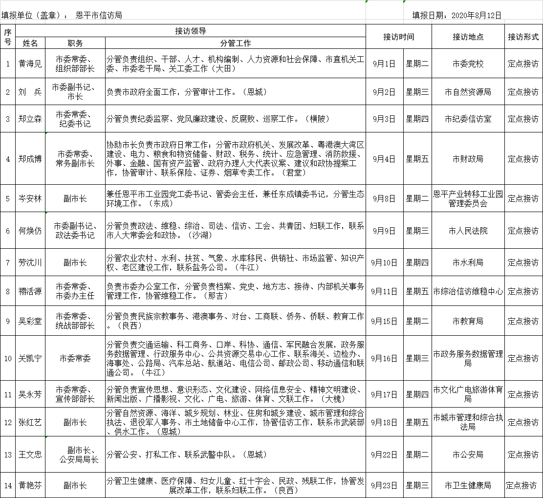 2020年9月份領(lǐng)導(dǎo)干部定期接待群眾來訪安排表