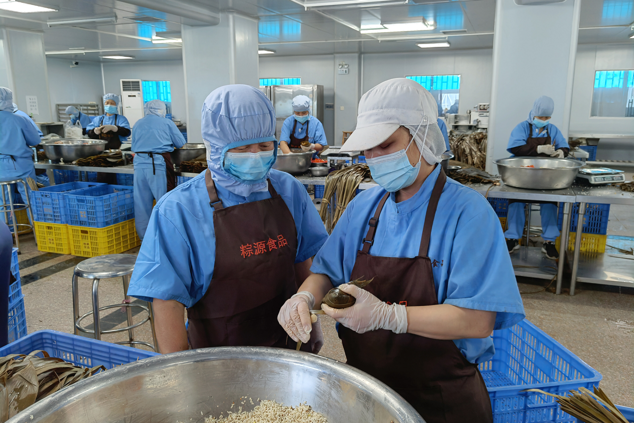 君堂鎮(zhèn)黨委依托恩平市粽源食品有限公司平臺,按照“黨建引領、企業(yè)帶動、群眾參與”的工作思路,深入發(fā)動各基層黨組織力量,通過實地走訪、訪談調查、問卷調查等多種方式,圍繞恩平裹粽制作技藝全面開展非遺傳承人摸底。廣泛收集非遺傳承人的技藝水平、傳承經驗、個人經歷等方面的信息,關注他們的生活狀況、傳承意愿及面臨的困難與挑戰(zhàn),為后續(xù)的支持與幫助提供精準依據。經過君堂鎮(zhèn)黨委和粽源食品公司的精心組織與篩選,成功匯聚了一支由40余名賦閑工人組成的“非遺傳承隊伍”,這支隊伍的成員年齡跨度在20至50歲之間,既有熟悉傳統(tǒng)裹粽制作流程的老一輩匠人,也有充滿活力的年輕新秀。恩平裹粽傳承人隊伍在堅守傳統(tǒng)精髓的同時,勇于創(chuàng)新,探索出多樣新手法,為恩平裹粽產業(yè)注入強勁新動力。