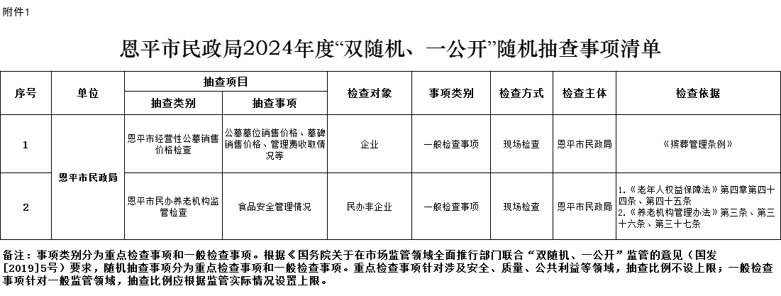 附件:1.恩平市民政局2024年度“雙隨機(jī)、一公開”隨機(jī)抽查事項(xiàng)清單