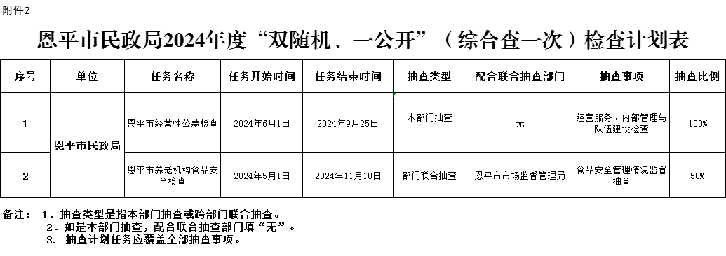 2.恩平市民政局2024年度“雙隨機(jī)、一公開”(綜合查一次)檢查計(jì)劃表