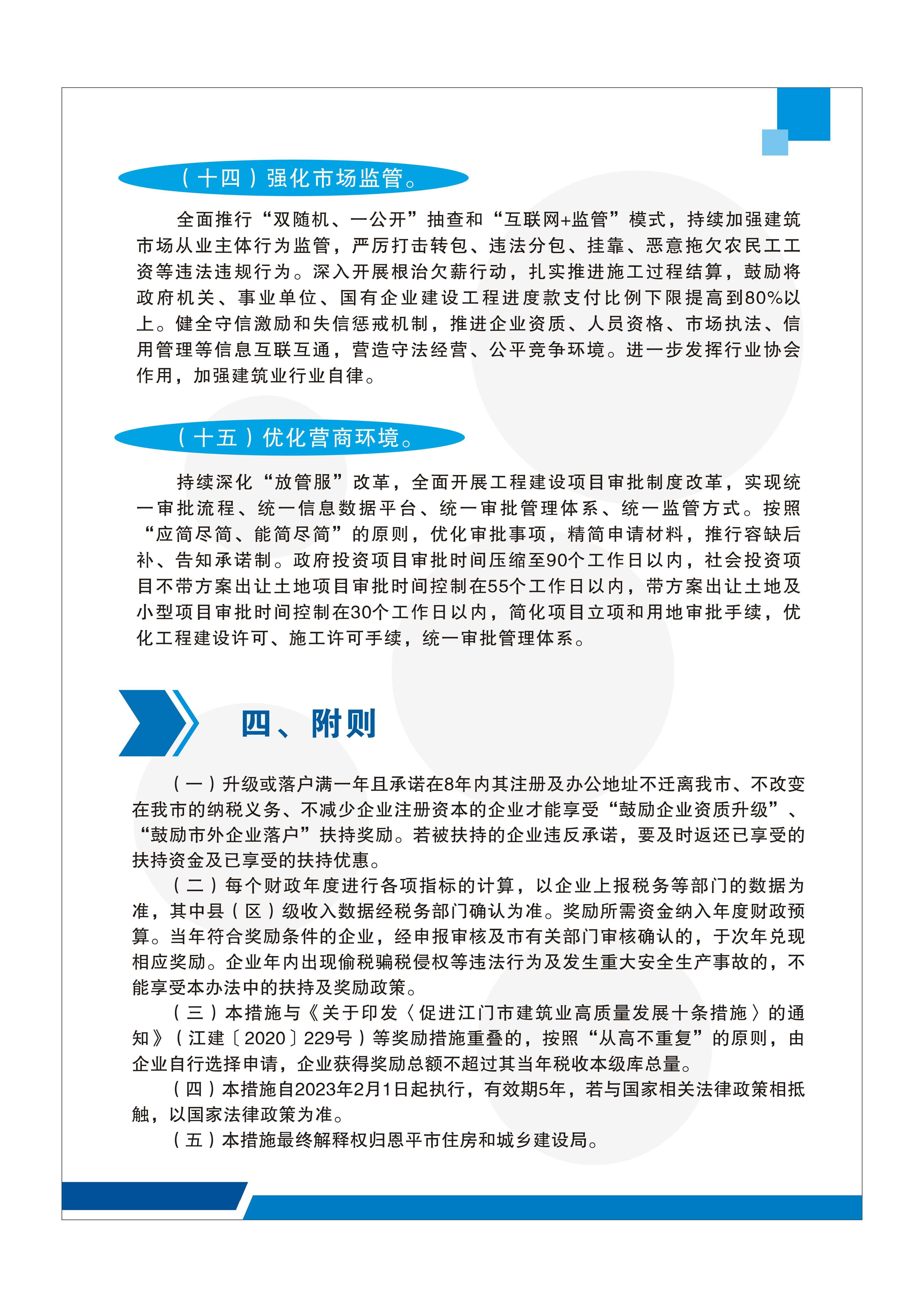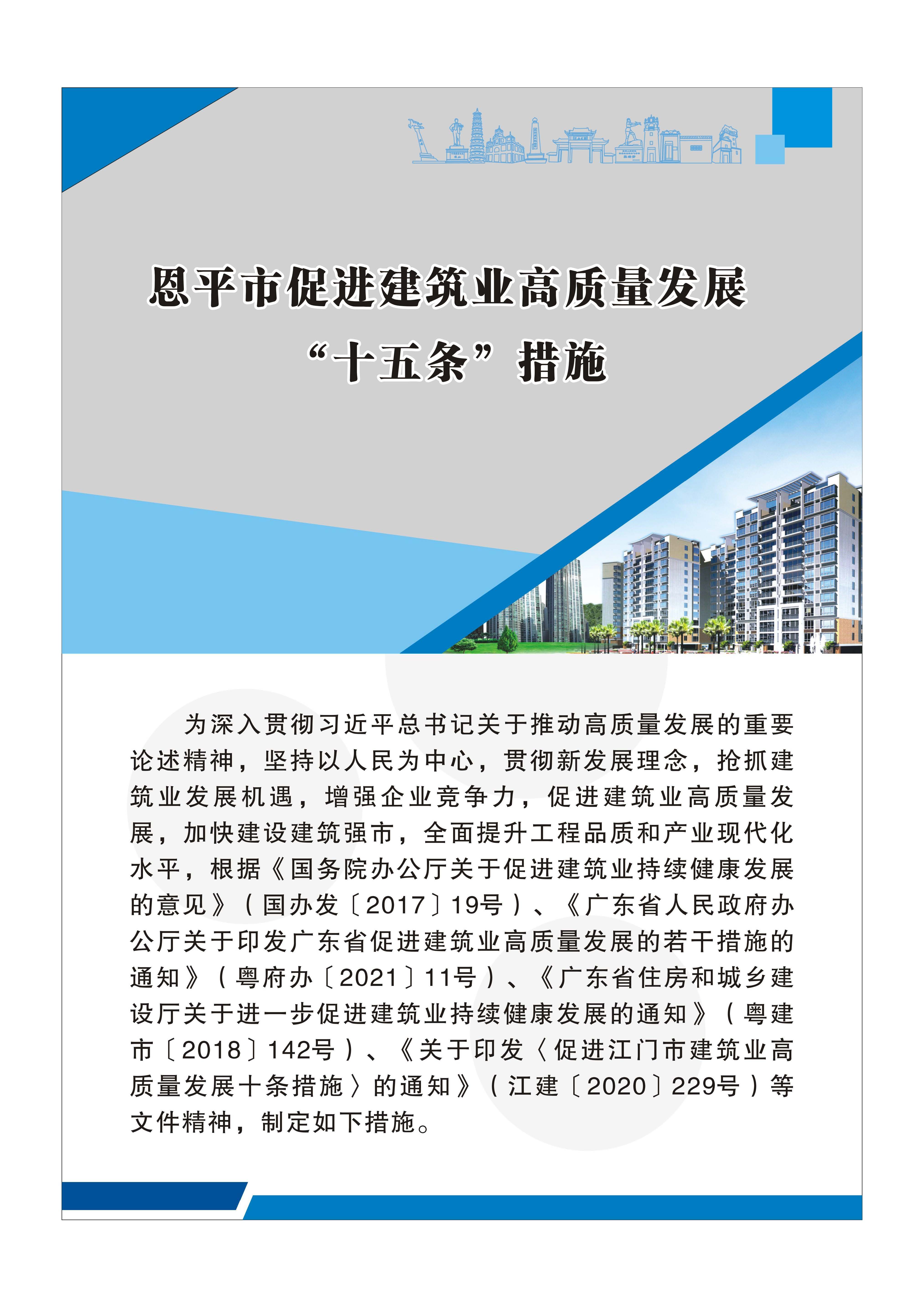 政策原文:關于印發(fā)《恩平市促進建筑業(yè)高質量發(fā)展“十五條”措施》的通知