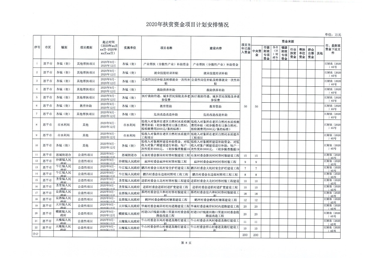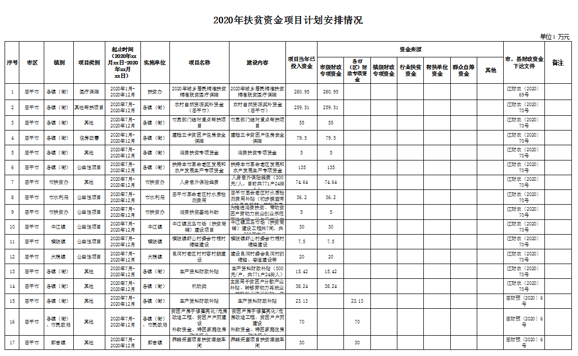 根據(jù)關(guān)于印發(fā)《江門市扶貧資金項目公告公示實施細則》的通知(江扶辦〔2018〕26號)的文件要求,為提高資金使用效益和透明度,促進扶貧資金項目常態(tài)化公開,現(xiàn)對2020年扶貧資金項目計劃安排情況進行公示。