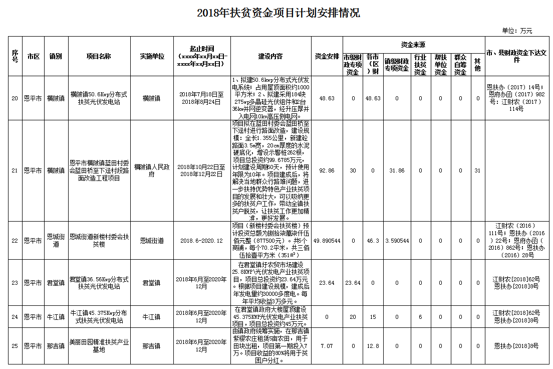 根據(jù)《江門市扶貧資金項目公告公示實施細則》(江扶辦〔2018〕26號)的文件要求,為提高資金使用效益和透明度,促進扶貧資金項目常態(tài)化公開,現(xiàn)對2018年扶貧資金項目計劃安排情況進行公示。