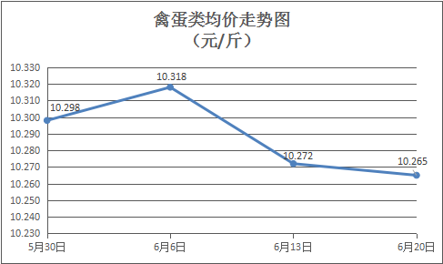禽蛋類商品價(jià)格窄幅盤整。本周所監(jiān)測的6種禽蛋類商品價(jià)格波動(dòng)情況為3漲2跌1平,綜合零售均價(jià)為10.265元/斤,環(huán)比下降0.06%。其中:白條雞、白條鴨零售均價(jià)分別為每斤18.91元、14.26元,環(huán)比分別上漲0.37%、上漲0.71%;紅殼雞蛋、鴨蛋零售均價(jià)分別為每斤6.28元、7.33元,環(huán)比分別下降2.48%、上漲0.83%。