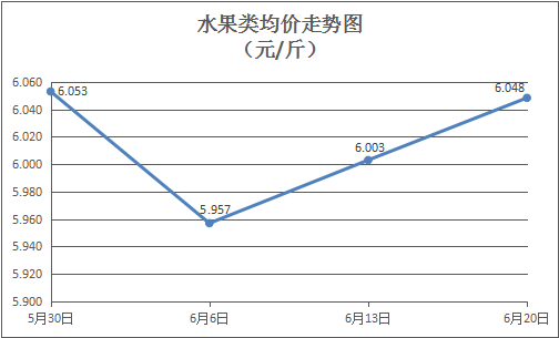 水果類商品價(jià)格總體略漲。本周所監(jiān)測的6種水果商品價(jià)格波動(dòng)情況為4漲1跌1平,綜合零售均價(jià)為6.048元/斤,環(huán)比上漲0.75%。其中橙子、香蕉、西瓜零售均價(jià)分別為每斤5.73元、3.36元、2.74元,環(huán)比分別上漲1.24%、上漲1.20%、下降1.08%。