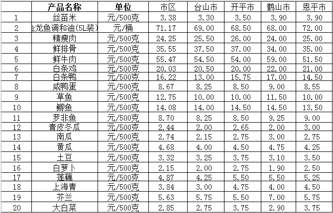 說明:1、表中價(jià)格為該地區(qū)監(jiān)測點(diǎn)綜合平均價(jià);2、“市區(qū)”含蓬江區(qū)、江海區(qū)、新會(huì)區(qū),價(jià)格分別采自蓬江市場、江南市場、城東市場等13家農(nóng)貿(mào)市場;3、其他四個(gè)縣市價(jià)格分別采自新華市場、錦江市場等8家農(nóng)貿(mào)市場。