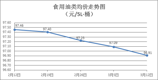 食用油類商品價格總體略降。本周所監(jiān)測的9種食用油(5L裝)商品價格波動情況為1漲5跌3平,綜合零售均價為96.91元/桶,環(huán)比下降0.18%。其中:魯花花生油、金龍魚調(diào)和油零售均價分別為每桶157.51元、71.46元,環(huán)比分別下降0.63%、持平。