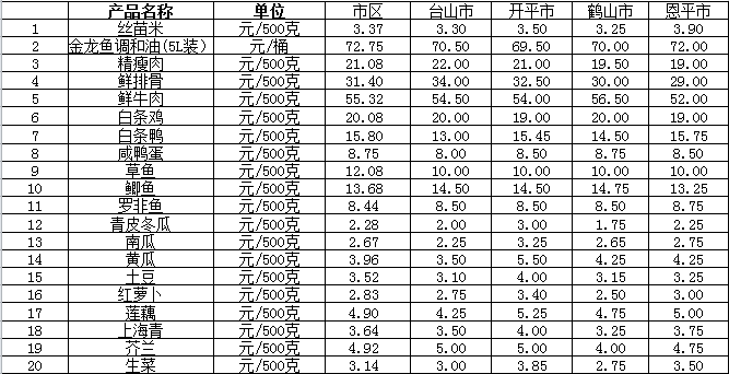 說明:1、表中價格為該地區(qū)監(jiān)測點綜合平均價;2、“市區(qū)”含蓬江區(qū)、江海區(qū)、新會區(qū),價格分別采自蓬江市場、江南市場、城東市場等13家農(nóng)貿(mào)市場;3、其他四個縣市價格分別采自新華市場、錦江市場等8家農(nóng)貿(mào)市場。