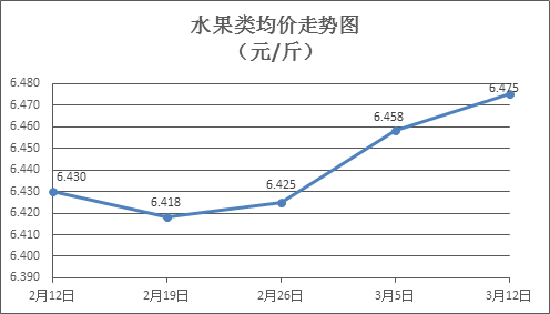 水果類商品價格總體微漲。本周所監(jiān)測的6種水果商品價格波動情況為3漲2跌1平,綜合零售均價為6.475元/斤,環(huán)比上漲0.26%。其中蘋果、香蕉、梨零售均價分別為每斤7.13元、3.12元、6.01元,環(huán)比分別下降0.14%、持平、上漲0.84%。