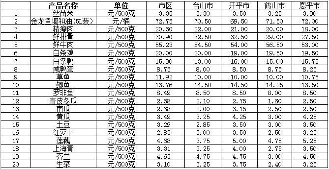說(shuō)明:1、表中價(jià)格為該地區(qū)監(jiān)測(cè)點(diǎn)綜合平均價(jià);2、“市區(qū)”含蓬江區(qū)、江海區(qū)、新會(huì)區(qū),價(jià)格分別采自蓬江市場(chǎng)、江南市場(chǎng)、城東市場(chǎng)等13家農(nóng)貿(mào)市場(chǎng);3、其他四個(gè)縣市價(jià)格分別采自新華市場(chǎng)、錦江市場(chǎng)等8家農(nóng)貿(mào)市場(chǎng)。