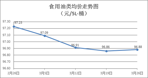 食用油類商品價(jià)格微幅波動(dòng)。本周所監(jiān)測(cè)的9種食用油(5L裝)商品價(jià)格波動(dòng)情況為1升6降2平,綜合零售均價(jià)為96.88元/桶,環(huán)比上漲0.02%。其中:胡姬花花生油、大豆油零售均價(jià)分別為每桶145.83元、61.53元,環(huán)比分別上漲0.57%、下降0.18%。