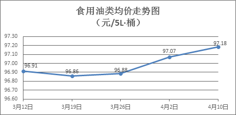食用油類商品價格總體微升。本周所監(jiān)測的9種食用油(5L裝)商品價格浮動情況為5漲3跌1平,綜合零售均價為97.18元/桶,環(huán)比上漲0.12%。其中:金龍魚花生油、金龍魚調(diào)和油零售均價分別為每桶105.44元、71.71元,環(huán)比分別上漲0.34%、上漲0.03%。