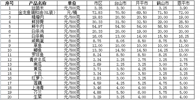說明:1、表中價格為該地區(qū)監(jiān)測點綜合平均價;2、“市區(qū)”含蓬江區(qū)、江海區(qū)、新會區(qū),價格分別采自蓬江市場、江南市場、城東市場等13家農(nóng)貿(mào)市場;3、其他四個縣市價格分別采自新華市場、錦江市場等8家農(nóng)貿(mào)市場。