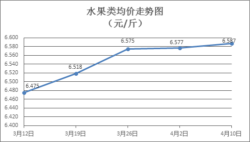 水果類商品價格小幅盤升。本周所監(jiān)測的6種水果商品價格波動情況為4漲2跌,綜合零售均價為6.587元/斤,環(huán)比上漲0.15%。其中蘋果、香蕉、葡萄零售均價分別為每斤7.16元、3.24元、13.04元,環(huán)比分別上漲0.28%、上漲1.89%、下降0.15%。