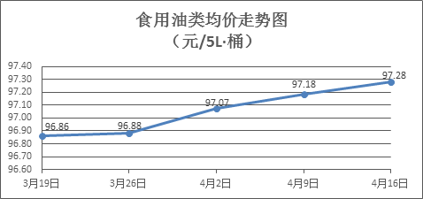 食用油類商品價格總體微升。本周所監(jiān)測的9種食用油(5L裝)商品價格波動情況為7漲1跌1平,綜合零售均價為97.28元/桶,環(huán)比上漲0.10%。其中:金龍魚花生油、金龍魚調(diào)和油零售均價分別為每桶105.74元、71.83元,環(huán)比分別上漲0.28%、上漲0.17%。