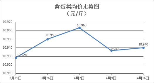 家禽類商品價格略有小漲。本周所監(jiān)測的6種禽蛋類商品價格波動情況為3漲2跌1平,綜合零售均價為10.940元/斤,環(huán)比上漲0.03%。其中:白條雞、白條鴨零售均價分別為每斤20.00元、15.32元,環(huán)比分別上漲0.60%、上漲0.72%;白殼雞蛋、鴨蛋零售均價分別為每斤6.90元、7.82元,環(huán)比分別下降0.58%、持平。