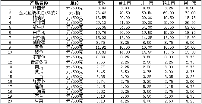 說明:1、表中價格為該地區(qū)監(jiān)測點綜合平均價;2、“市區(qū)”含蓬江區(qū)、江海區(qū)、新會區(qū),價格分別采自蓬江市場、江南市場、城東市場等13家農貿市場;3、其他四個縣市價格分別采自新華市場、錦江市場等8家農貿市場。