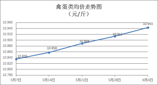 禽蛋類商品價格窄幅盤升。上周所監(jiān)測的6種禽蛋類商品價格波動情況為4漲2跌,綜合零售均價為10.943元/斤,環(huán)比上漲0.27%。其中:白條雞、白條鴨零售均價分別為每斤19.73元、15.63元,環(huán)比分別上漲0.20%、下降0.64%;白殼雞蛋、鴨蛋零售均價分別為每斤6.73元、7.93元,環(huán)比分別上漲1.05%、上漲0.38%。