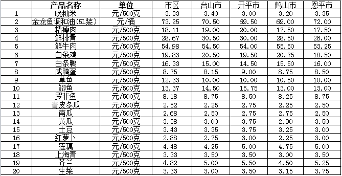 說明:1、表中價格為該地區(qū)監(jiān)測點綜合平均價;2、“市區(qū)”含蓬江區(qū)、江海區(qū)、新會區(qū),價格分別采自蓬江市場、江南市場、城東市場等13家農(nóng)貿(mào)市場;3、其他四個縣市價格分別采自新華市場、錦江市場等8家農(nóng)貿(mào)市場。