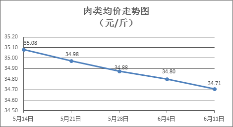 肉類商品價(jià)格總體微降。上周所監(jiān)測的8種肉類商品價(jià)格波動情況為2漲6跌,綜合零售均價(jià)為34.71元/斤,環(huán)比下降0.27%。其中:排骨、精瘦肉、有皮上肉、牛肉、帶骨羊肉零售均價(jià)分別為每斤28.69元、18.27元、14.06元、54.53元、45.57元,環(huán)比分別下降0.07%、下降0.87%、上漲0.36%、下降0.27%、下降0.59%。