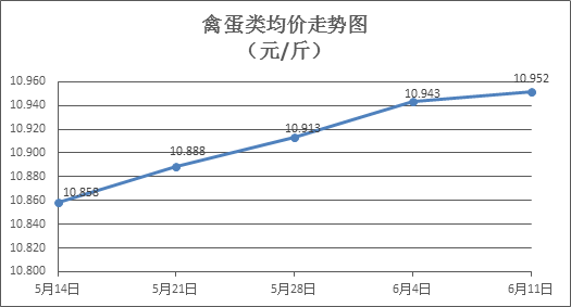 禽蛋類商品價(jià)格微幅盤升。上周所監(jiān)測的6種禽蛋類商品價(jià)格波動情況為4漲1跌1平,綜合零售均價(jià)為10.952元/斤,環(huán)比上漲0.08%。其中:白條雞、白條鴨零售均價(jià)分別為每斤19.75元、15.66元,環(huán)比分別上漲0.10%、上漲0.19%;白殼雞蛋、鴨蛋零售均價(jià)分別為每斤6.76元、7.93元,環(huán)比分別上漲0.45%、持平。