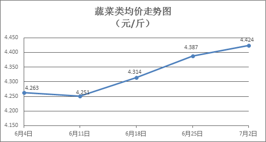 據(jù)本市21家農(nóng)貿(mào)市場(chǎng)監(jiān)測(cè)數(shù)據(jù)顯示,上周(6月26日至7月2日,下同)市場(chǎng)上各類(lèi)“菜籃子”商品供應(yīng)充足,所監(jiān)測(cè)的7大類(lèi)“菜籃子”商品價(jià)格3漲4跌。其中:糧食類(lèi)商品價(jià)格基本平穩(wěn),食用油類(lèi)、豬肉類(lèi)、禽蛋類(lèi)、水果類(lèi)商品價(jià)格總體略降,牛羊類(lèi)、蔬菜類(lèi)商品價(jià)格有所上漲,水產(chǎn)類(lèi)商品價(jià)格微幅盤(pán)整。近期高溫天氣持續(xù),預(yù)計(jì)近期部分禽蛋類(lèi)商品價(jià)格有所回調(diào)。