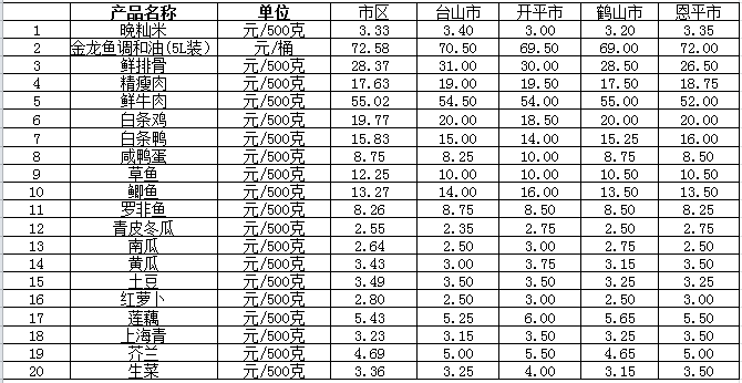 說明:1、表中價格為該地區(qū)監(jiān)測點(diǎn)綜合平均價;2、“市區(qū)”含蓬江區(qū)、江海區(qū)、新會區(qū),價格分別采自蓬江市場、江南市場、城東市場等13家農(nóng)貿(mào)市場;3、其他四個縣市價格分別采自新華市場、錦江市場等8家農(nóng)貿(mào)市場。