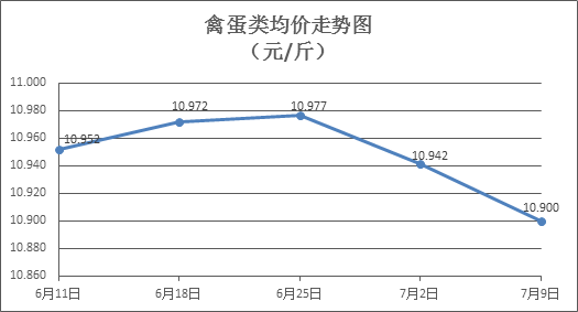 禽蛋類商品價格普遍下降。上周所監(jiān)測的6種禽蛋類商品價格波動情況為1漲5跌,綜合零售均價為10.900元/斤,環(huán)比下降0.38%。其中:白條雞、白條鴨零售均價分別為每斤19.75元、15.41元,環(huán)比分別下降0.40%、下降0.96%;白殼雞蛋、鴨蛋零售均價分別為每斤6.68元、7.93元,環(huán)比分別下降0.30%、上漲0.38%。