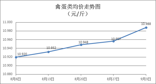 禽蛋類商品價格總體略漲。上周所監(jiān)測的6種禽蛋類商品價格波動情況為4漲1跌1平,綜合零售均價為10.988元/斤,環(huán)比上漲0.29%。其中:白條雞、白條鴨零售均價分別為每斤19.62元、15.68元,環(huán)比分別上漲0.62%、上漲0.26%;白殼雞蛋、鴨蛋零售均價分別為每斤6.77元、7.93元,環(huán)比分別上漲0.45%、持平。