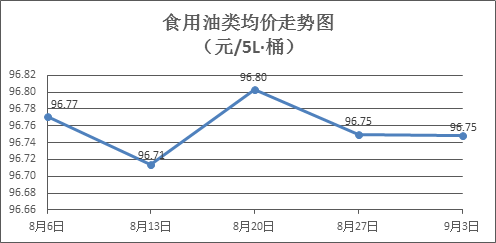 食用油類商品價格微幅波動。上周所監(jiān)測的9種食用油(5L裝)商品價格波動情況為3漲2跌4平,綜合零售均價為96.75元/桶,環(huán)比持平。其中:金龍魚花生油、金龍魚調(diào)和油零售均價分別為每桶104.65元、70.96元,環(huán)比分別上漲0.05%、持平。