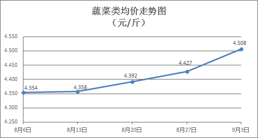 蔬菜類商品價格普遍上漲。上周所監(jiān)測的32 種蔬菜商品價格波動情況為26漲3跌3平,綜合零售均價為4.508元/斤,環(huán)比上漲1.81%。其中:漲幅居前的品種包括生菜、絲瓜、大白菜,零售均價分別為每斤3.76元、4.09元、2.98元,環(huán)比分別上漲6.21%、5.96%、4.93%;跌幅居前的品種包括蓮藕、青皮冬瓜、青尖椒,零售均價分別為每斤4.56元、2.42元、4.71元,環(huán)比分別下降1.51%、0.82%、0.21%。