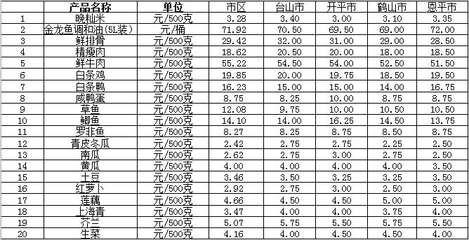 說明:1、表中價格為該地區(qū)監(jiān)測點(diǎn)綜合平均價;2、“市區(qū)”含蓬江區(qū)、江海區(qū)、新會區(qū),價格分別采自蓬江市場、江南市場、城東市場等13家農(nóng)貿(mào)市場;3、其他四個縣市價格分別采自新華市場、錦江市場等8家農(nóng)貿(mào)市場。