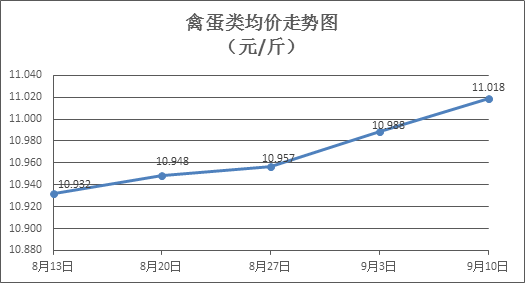 禽蛋類商品價格小幅略漲。上周所監(jiān)測的6種禽蛋類商品價格波動情況為4漲1跌1平,綜合零售均價為11.018元/斤,環(huán)比上漲0.27%。其中:白條雞、白條鴨零售均價分別為每斤19.59元、15.75元,環(huán)比分別下降0.15%、上漲0.45%;白殼雞蛋、鴨蛋零售均價分別為每斤6.83元、7.93元,環(huán)比分別上漲0.89%、持平。