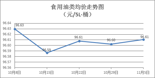 食用油類商品價格穩(wěn)中微漲。上周所監(jiān)測的9種食用油(5L裝)商品價格波動情況為3漲6平,綜合零售均價為96.61元/桶,環(huán)比上漲0.01%。其中:魯花花生油、金龍魚調(diào)和油零售均價分別為每桶157.41元、74.89元,環(huán)比分別上漲0.01%、持平。