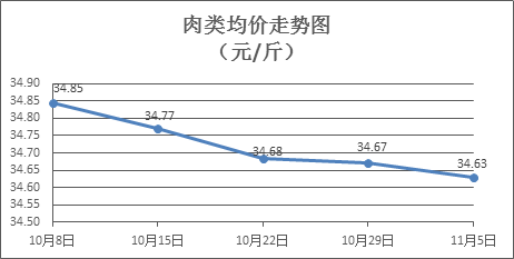 肉類商品價格微幅盤降。上周所監(jiān)測的8種肉類商品價格波動情況為4漲3跌1平,綜合零售均價為34.63元/斤,環(huán)比下降0.12%。其中:排骨、精瘦肉、有皮上肉、牛肉、帶骨羊肉零售均價分別為每斤29.65元、18.81元、14.43元、54.06元、43.98元,環(huán)比分別下降0.74%、下降0.69%、持平、上漲0.26%、下降0.68%。