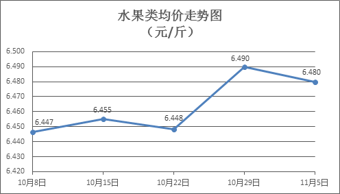 水果類商品價格略有下降。上周所監(jiān)測的6種水果商品價格波動情況為2漲3跌1平,綜合零售均價為6.480元/斤,環(huán)比下降0.15%。其中蘋果、香蕉、葡萄零售均價分別為每斤7.35元、3.05元、13.10元,環(huán)比分別下降0.27%、下降0.33%、上漲0.15%。