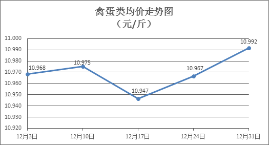 家禽類商品價(jià)格小幅上漲。上周所監(jiān)測的6種禽蛋類商品價(jià)格波動(dòng)情況為2漲1跌3平,綜合零售均價(jià)為10.992元/斤,環(huán)比上漲0.23%。其中:白條雞、白條鴨零售均價(jià)分別為每斤19.85元、15.44元,環(huán)比分別上漲0.81%、上漲0.19%;白殼雞蛋、鴨蛋零售均價(jià)分別為每斤6.77元、7.98元,環(huán)比分別持平、下降0.50%。