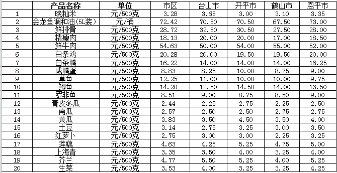 說明:1、表中價(jià)格為該地區(qū)監(jiān)測點(diǎn)綜合平均價(jià);2、“市區(qū)”含蓬江區(qū)、江海區(qū)、新會(huì)區(qū),價(jià)格分別采自蓬江市場、江南市場、城東市場等13家農(nóng)貿(mào)市場;3、其他四個(gè)縣市價(jià)格分別采自新華市場、錦江市場等8家農(nóng)貿(mào)市場。