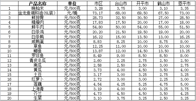 說明:1、表中價格為該地區(qū)監(jiān)測點(diǎn)綜合平均價;2、“市區(qū)”含蓬江區(qū)、江海區(qū)、新會區(qū),價格分別采自蓬江市場、江南市場、城東市場等13家農(nóng)貿(mào)市場;3、其他四個縣市價格分別采自新華市場、錦江市場等8家農(nóng)貿(mào)市場。