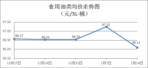 食用油類商品價格總體略降。上周所監(jiān)測的9種食用油(5L裝)商品價格波動情況為4漲3跌2平,綜合零售均價為96.11元/桶,環(huán)比下降1.17%。其中:魯花花生油、金龍魚調(diào)和油零售均價分別為每桶155.37元、70.94元,環(huán)比分別下降0.68%、上漲0.08%。