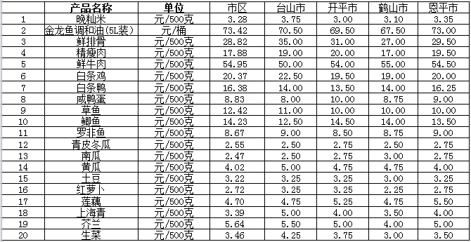 說明:1、表中價格為該地區(qū)監(jiān)測點綜合平均價;2、“市區(qū)”含蓬江區(qū)、江海區(qū)、新會區(qū),價格分別采自蓬江市場、江南市場、城東市場等13家農(nóng)貿市場;3、其他四個縣市價格分別采自新華市場、錦江市場等8家農(nóng)貿市場。